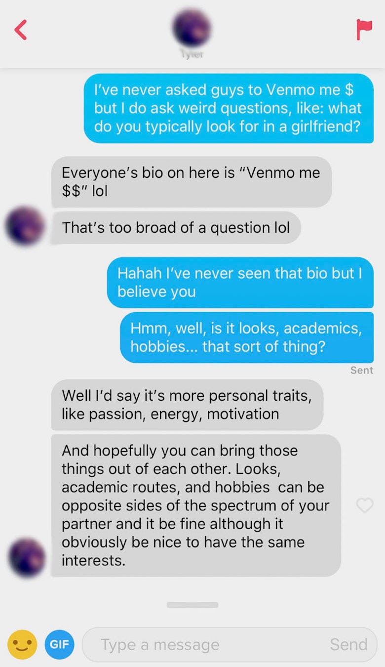 These are just a few questions you should ask yourself. Because we want you to keep swiping right without being scammed. Since you are asking questions, you should know what you are looking for as well. 'shall i get us a room or do you want to drink in the hotel lobby first?' he asked. Tinder matches people by simple mutual interest. Legit dude thanks for linking me to this. If your match wants to meet your dog: Set boundaries on your chat time and ask for that date early! What you're looking for is something to reference when you start your conversation, a subject that you can base your opening message on. Why a lion, do you like pouncing on your tinder prey? ohh you must be dangerous…i should tread lightly. 3.4 can people find out if i have a plus or gold subscription or not? Are you over analysing the match you've made and wishing you had asked more questions to find out what they're really like? Even if you're paying for a premium account!