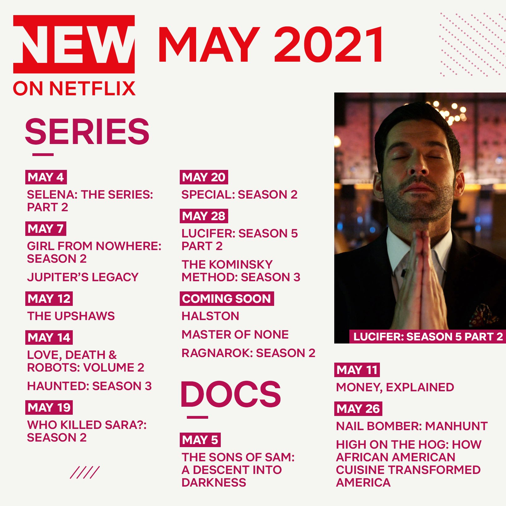 The following titles coming to netflix are as follows (updated as of 25th july): Everything coming to netflix in may 2020, including season 2 of dead to me. Here's what's coming to netflix in may 2020. See below for everything coming to and leaving netflix this may. Here's a look at the biggest tv series arriving on the service in the new year.